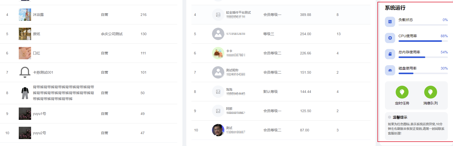 1)展示今日交易额、会员总额、今日订单数、待付款订单、待发货订单、7日内订单趋势图、7日订单销售额趋势图、服务器状态;