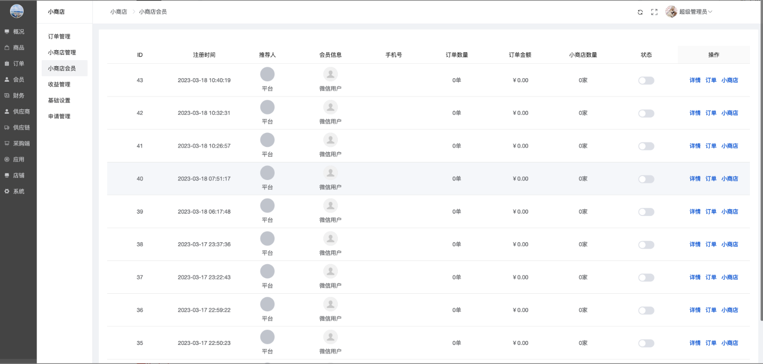 显示所有的小商店列表,支持查看小商店订单、收益等。