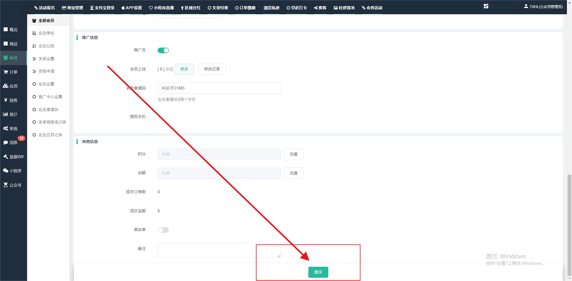 目录 搜索 展开 一、前期准备资料二、数字乡村码-上线操作指南1、服务号的申请流程及认证2、申请小程序流程3、开放平台绑定小程序和公众号三、数字乡村码-系统操作数字乡村码系统管理-概况数字乡村码-商品管理1、发布商品2、商品列表3、商品表单4、商品分类5、品牌管理6、配送模板7、评论管理8、优惠券管理9、商品标签10、退货地址设置11、满额优惠12、批量操作13、配送方式14、基础设置15、商品隐藏四、数字乡村码-会员管理1、全部会员2、会员等级3、会员分组4、资格申请5、会员设置6、推广中心设置7、会员邀请码8、会员关系链修改关系链修改记录9、会员合并记录10、账号注销管理11、会员设置中心五、数字乡村码-订单管理1、订单管理列表2、订单处理流程3、订单状态4、订单修改价格5、订单退款退货6、多包裹发货7、批量发货订单操作步骤8、催发货订单9、物流查询六、数字乡村码-财务管理1、余额设置2、会员余额3、充值记录4、转让记录5、余额明细6、收入明细7、提现设置8、提现统计9、积分管理10、转账审核11、收益广告12、批量充值七、数字乡村码-系统管理1、商城入口2、商城设置①、商城设置②、订单设置③、物流查询④、短信⑤、联系方式⑥、分类⑦、优惠券⑧、分享⑨、幻灯片⑩、广告位⑫、地图设置3、交易设置4、微信模板消息自定义消息模板(新版)自定义消息模板(旧版)小程序消息模板公众号模板消息变更公告5、语言设置6、权限管理7、多媒体管理八、数字乡村码-消息管理九、数字乡村码-应用管理十、数字乡村码系统-数据统计十一、数字乡村码-页面装修DIY1、模板管理2、店铺页面3、顶部导航4、底部导航5、DIY模板市场6、首屏广告7、基础设置8、装修DIY尺寸建议十二、供应商功能插件操作指南1、供应商2、门店-收银台门店申请和使用步骤门店管理①、门店-收银台 营销设置②、门店-收银台 分润设置门店分类门店申请门店审核门店商品门店商品订单收银台订单数据统计核销员基础设置默认设置门店装修3、微社区4、会务活动十三、营销插件操作指南活动报名提货卡新人奖微店问卷调查积分视频分享1、视频分享基础设置2、视频分享发现管理3、视频分享分类管理4、视频分享评论管理5、视频分享分红记录6、视频分享短视频中心每日红包幸运大抽奖签到优惠券二维码任务奖励优惠劵文章音频文章付费文章限时购新海报拓客卡操作流程积分活动素材中心视频红包十四、入驻门店应用类1、门店预约2、附近商品3、门店定位设置4、门店控制5、门店满额包邮6、门店满额减7、导入商品8、门店搜索9、门店股东10、核销券11、多门店核销1、商城后台设置2、前端功能演示十五、常见问题1、后台登录密码修改流程2、会员-余额,积分,后台如何进行充值与扣除3、如何修改上下级关系4、一种万能的获取商城小程序路径的方法 暂无相关搜索结果! 阅读次数:1564 本文档使用 模王系统 发布 3、如何修改上下级关系 如何修改上下级关系一.如何修改上下级关系?1.会员-全部会员-可以通过搜索用户的独立ID,或者用户微信昵称,找到此会员,然后点击右边的(操作)2.再点击会员详情。3.滑到下面,有个推广信息-会员上线,点击修改4.输入上级的ID号,点击搜索,出来此上级会员后点击选择。5.滑到最下面,一定要点击提交按钮。文档更新时间: 2024-01-05 14:50 作者:链上旅行