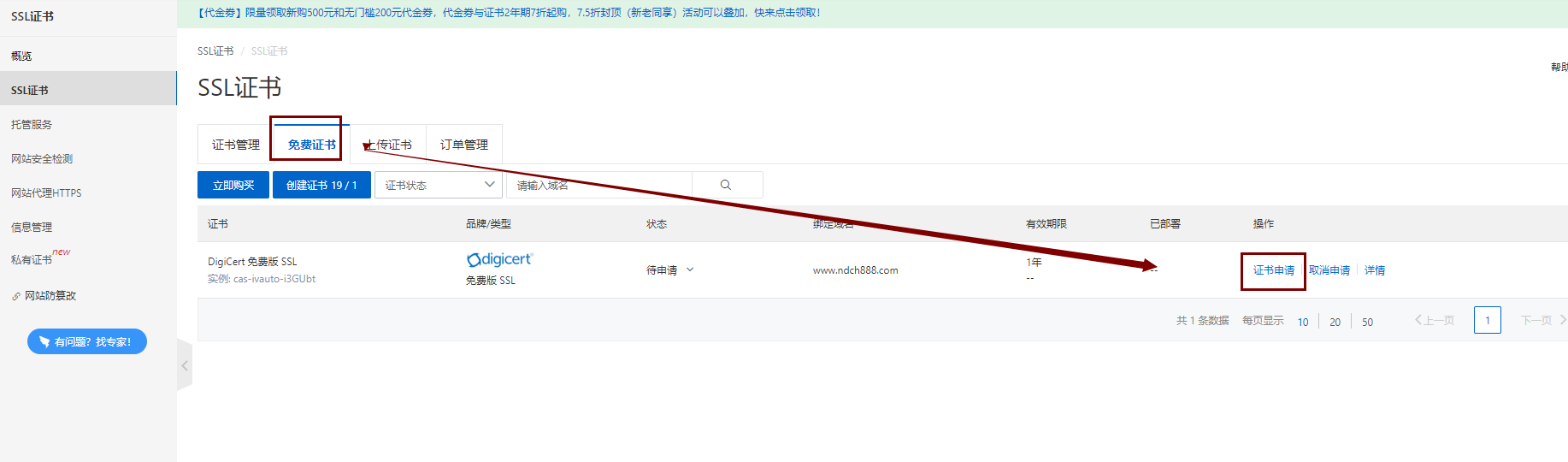 4、返回SSL证书,找到购买的证书,点击证书申请