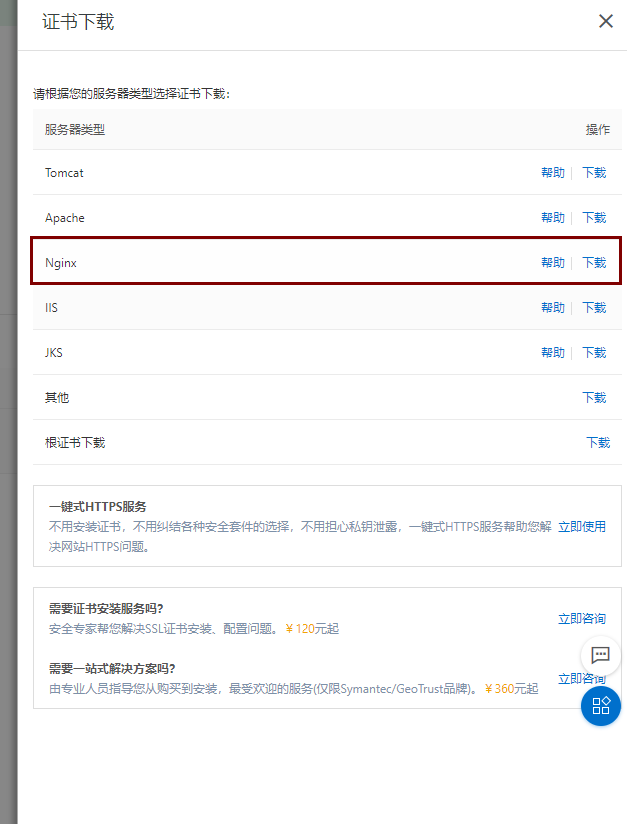 6、如果一切正常,申请的证书很快审核通过。点击下载,选择服务器类型:Ngnix;解压以后,你会得到两个文件一个是 *.key,一个是 *.pem。