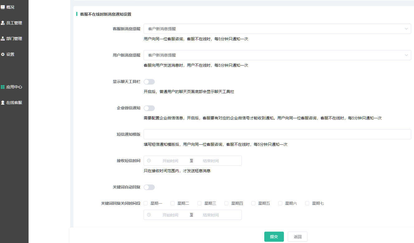 配置好企业微信相关功能后,开启该设置,当有新消息时,如果客服不在线,将通过企业微信应用发送通知。客服要有对应的企业微信号才能收到通知。用户向同一位客服咨询,客服不在线时,每5分钟只通知一次