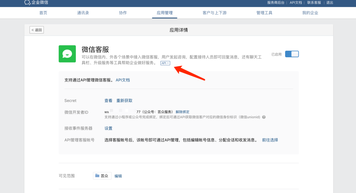 在企业微信管理后台(官方)--应用管理--微信客服中,拉到最后,找到通过API管理微信客服账号--企业内部开发,进行客服账号授权